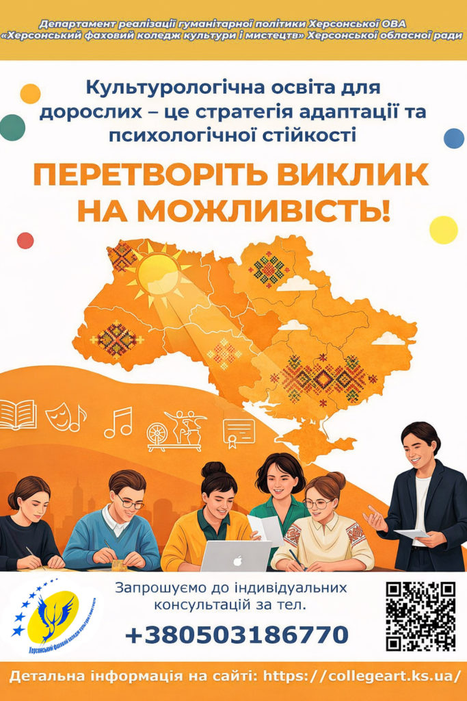 Комунальний заклад «Херсонський фаховий коледж культури і мистецтв» Херсонської обласної ради – це комфортне середовище для ВСІХ. Надаємо освітні послуги незалежно від місця перебування, віку, фізичних чи соціальних особливостей. З лютого 2022 року (до закінчення воєнного стану) Коледж надає послуги в ДИСТАНЦІЙНОМУ ФОРМАТІ. Про нас дізнатись можна зі сторінок в: