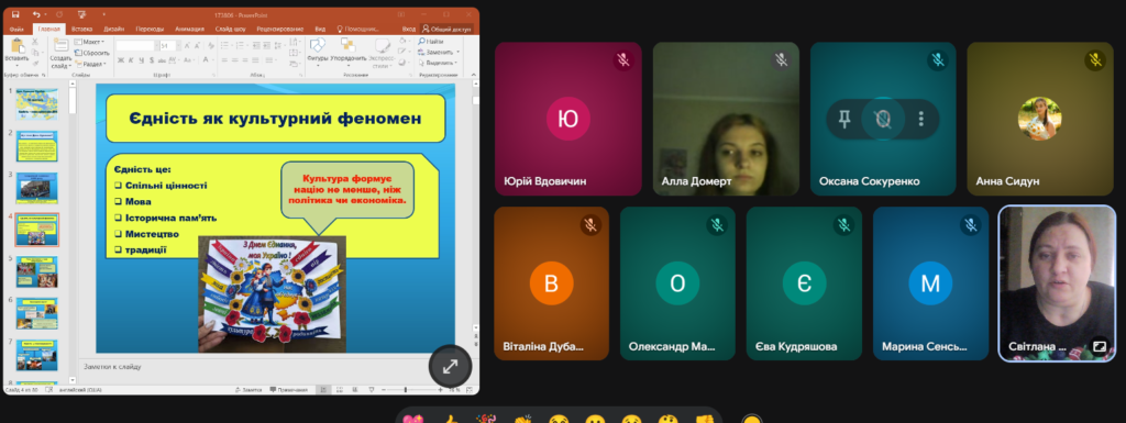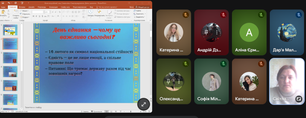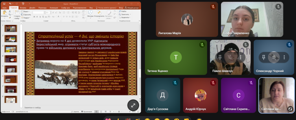 Здобувачі освіти I-II курсів під час зібрання звернулися до пізнавальних відео Софії Безверхої (про знищену українську інтелігенцію), Марії Словолюб (про необхідність спілкування українською) та Аліни Острозької (про русифікацію словників). Яскравим підсумком була сторінка журналу «Славна топоніміка», на якій студенти і педагоги встановлювали місця народження славетних українців, серед яких принагідно згадали Дніпрову Чайку та цьогорічну ювілярку (25 лютого виповнюється 155 років з дня народження) Лесю Українку, яка, за словами Оксани Забужко, «видала нам європейський паспорт».