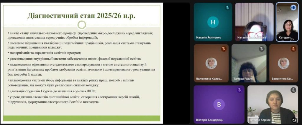 Голова ЦК Катерина Віннік ознайомила колег з перспективним планом реалізації науково-методичної проблеми, над якою працюватиме коледж у 2025-2030 рр., методичними рекомендаціями МОН України щодо запровадження та використання технологій штучного інтелекту в закладах загальної середньої та вищої освіти.