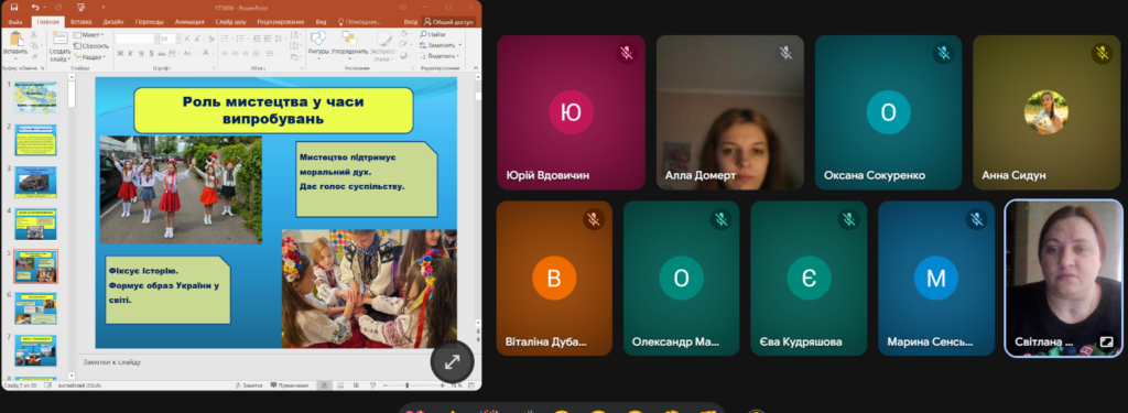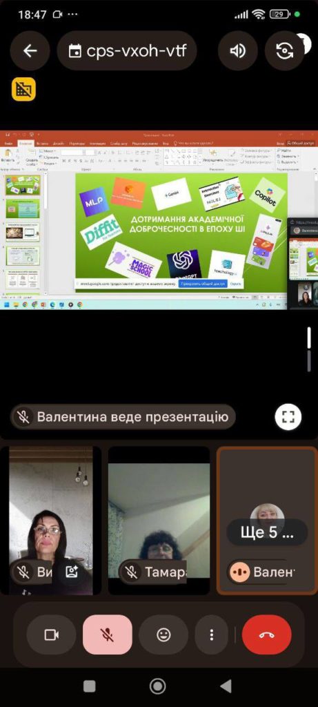 Миловидова Наталія проаналізувала основні види порушень академічної доброчесності, переваги та ризики застосування ШІ в системі освіти. Колеснікова Валентина розповіла про те, як ШІ-інструменти активізують пізнавальну активність здобувачів при вивченні української мови та літератури. Радик Тамара презентувала можливості використання ШІ на заняттях з фізичної культури. Якименко Наталя зосередилась на можливостях реалізації та розвитку креативності здобувачів освіти при вивченні математики, на проблемі об’єктивності оцінювання навчальних досягнень студентів. Бондарець Вікторія продемонструвала можливості сервісів перевірки контрольних робіт студентів на використання систем ШІ.
