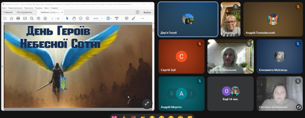 Здобувачі освіти Херсонського фахового коледжу культури і мистецтв долучилися до вшанування подвигу учасників Революції Гідності, узявши участь у низці тематичних заходів під спільним гаслом пам’яті та відповідальності. Студенти переглянули онлайн-презентацію з елементами обговорення на тему «Небесна Сотня – ціна свободи». Захід пройшов у форматі живого діалогу. Учасники зосередилися на темах свідомого вибору, відповідальності в часи історичних зламів та цінностей, за які варто боротися.