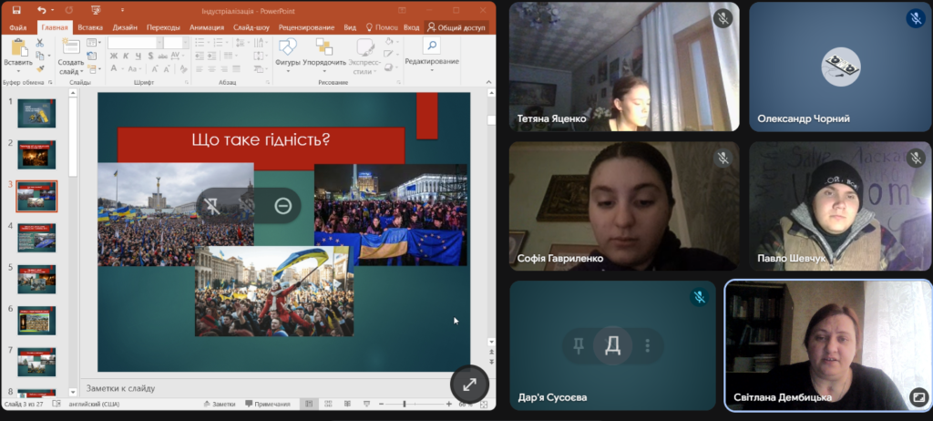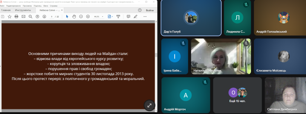 На заняттях з основ правознавства студенти обговорили проблемні питання, спираючись на засади міжнародного та національного права. Здобувачі освіти аргументували, чому право людини на протест та захист гідності є «природним» і невід’ємним, попри спроби тогочасної влади обмежити його «диктаторськими законами 16 січня» та моделювали механізми, які мали б спрацювати для запобігання трагедії на Майдані, якби законність та права людини були дотримані державою.