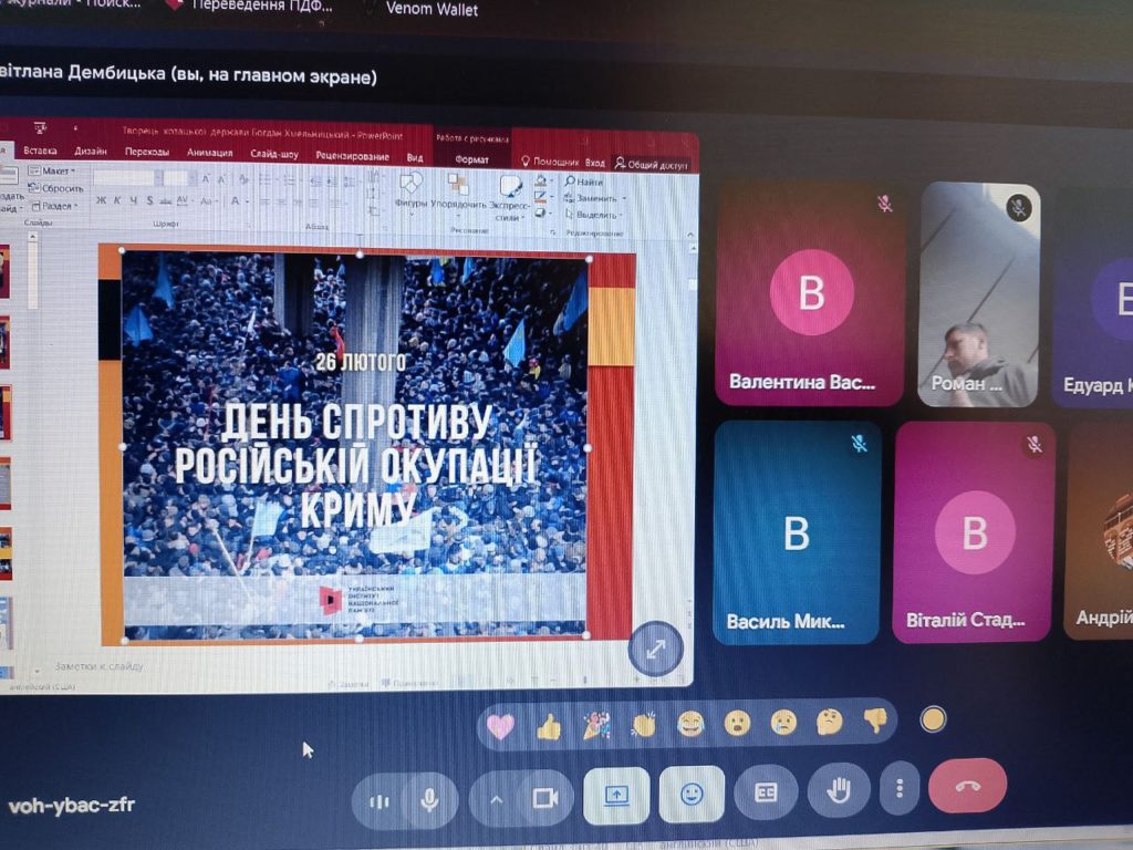 Здобувачі освіти Херсонського фахового коледжу культури і мистецтв на знак солідарності та глибокої шани узяли участь у низці тематичних заходів. Під час брейн-рингу «Кримський вузол: історія, спротив, майбутнє» студенти актуалізували знання про історичне минуле Криму та хронологію подій весни 2014 року. Круглий стіл на тему «Нескорений Крим» був присвячений глибокому аналізу історії півострова, його статусу в часи УНР, деталям входження до складу УРСР у 1954 році та визначній ролі Курултаю. Окрему увагу приділили подвигам громадських активістів у їхньому прагненні зберегти національну ідентичність в умовах окупації. У ході правового лекторію на тему: «Крим у міжнародному правовому полі» студенти проаналізували статус Криму як “тимчасово окупованої території” та обговорили правові наслідки окупації для цивільного населення.