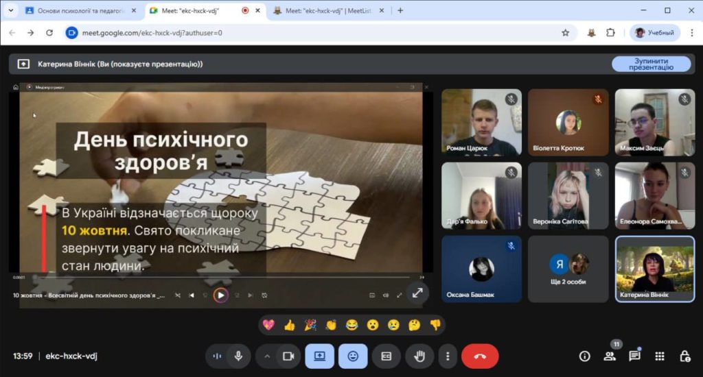 З метою підтримки психічного здоров’я 3 жовтня в Херсонському фаховому коледжі культури і мистецтв проведено онлайн – зустріч здобувачів освіти із психологом, психотерапевтом, кандидатом філологічних наук, провідним спеціалістом Lifeline Ukraine Галиною Кравченко. Обговорювалися найпоширеніши міфи про самогубство, ознаки суїцидальної поведінки, ресурси, які можуть допомогти запобігти самогубству та інше.