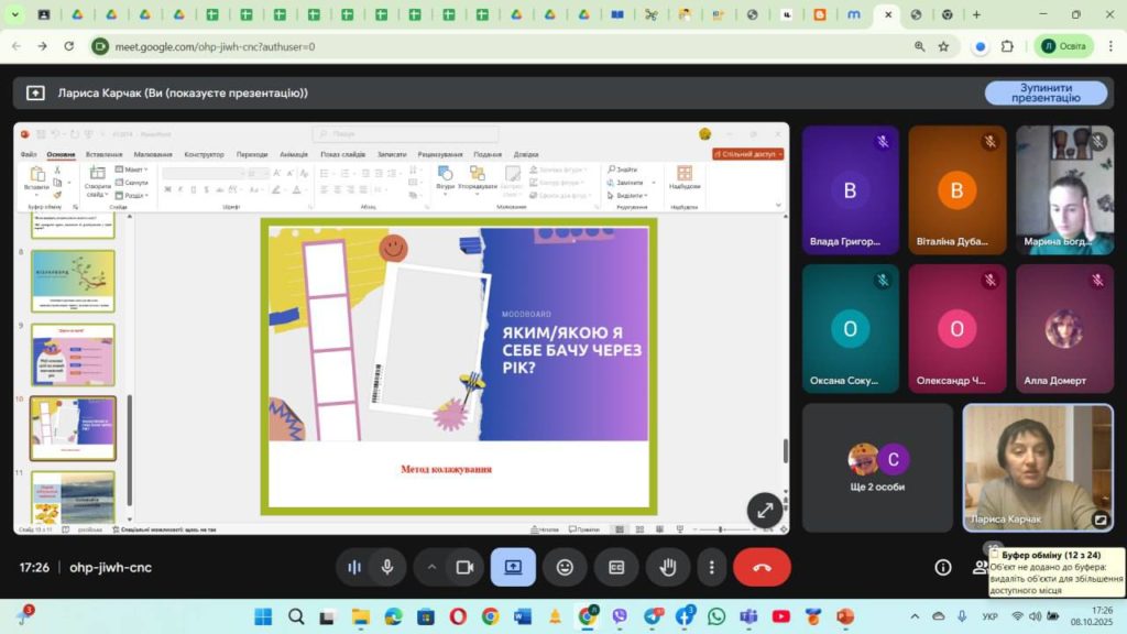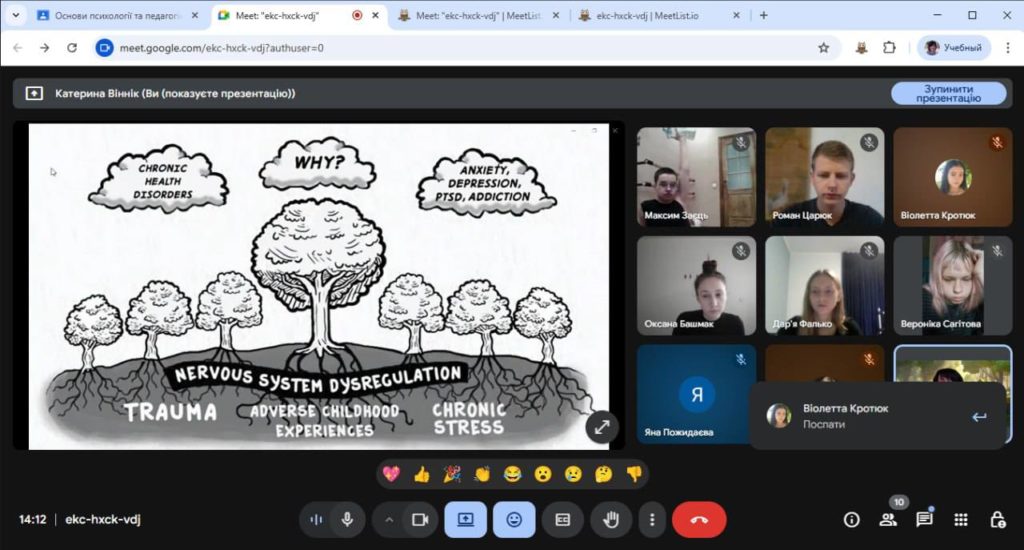 Студенти продіагностували свій рівень ресурсності на сьогодні за 10-бальною шкалою (були цифри від 3 до 9), поділилися причинами виснаження (перевантаження від навчання, стреси, недостатня кількість годин сну, хвороба, тривожність, тощо), розповіли про власні шляхи подолання негативних наслідків стресу (прогулянка, сон, улюблена книга, спів, танці, смаколики, квіти, домашні улюбленці, спілкування з дорогою людиною, кохання, котики).