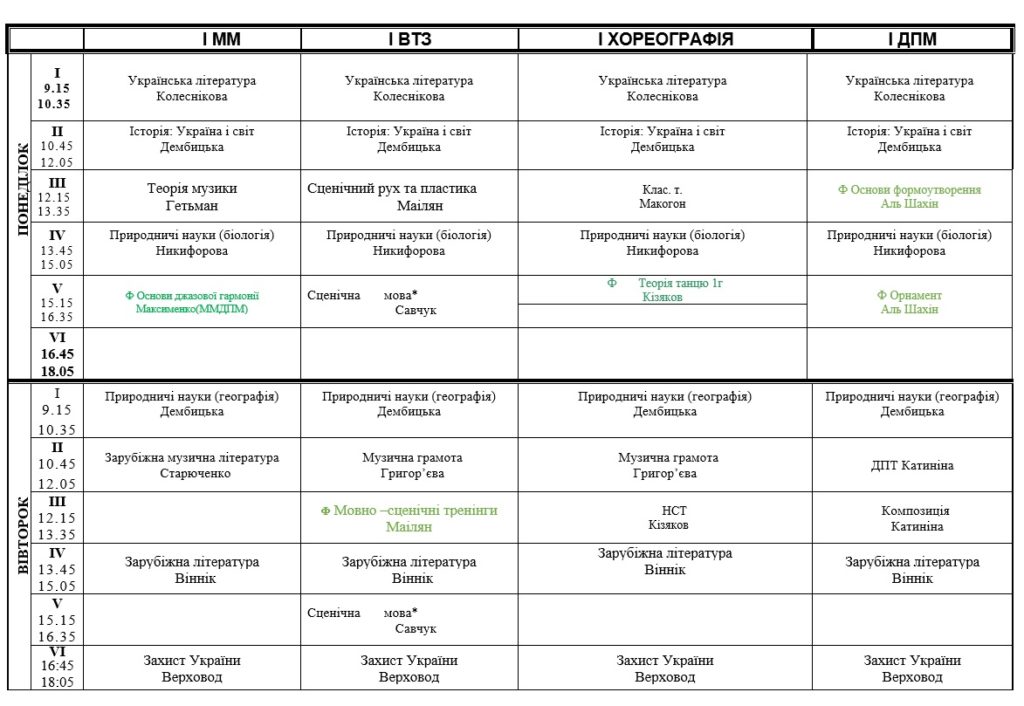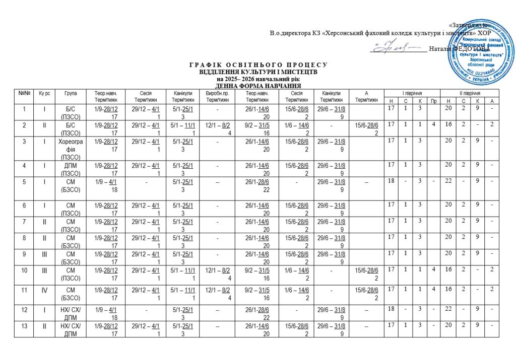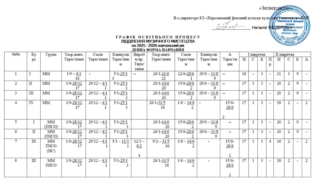 РОЗКЛАД ЕКЗАМЕНІВ АТЕСТАЦІЇ ЗДОБУВАЧІВ ФПО ДЕННОЇ ФОРМИ НАВЧАННЯ СПЕЦІАЛЬНОСТІ 023 «ОБРАЗОТВОРЧЕ МИСТЕЦТВО, ДЕКОРАТИВНЕ МИСТЕЦТВО, РЕСТАВРАЦІЯ», СПЕЦІАЛЬНОСТІ 024 «ХОРЕОГРАФІЯ», СПЕЦІАЛЬНОСТІ 025 «МУЗИЧНЕ МИСТЕЦТВО», СПЕЦІАЛЬНОСТІ 026 «СЦЕНІЧНЕ МИСТЕЦТВО» З 16.06. ПО 28.06.2025 РОКУ