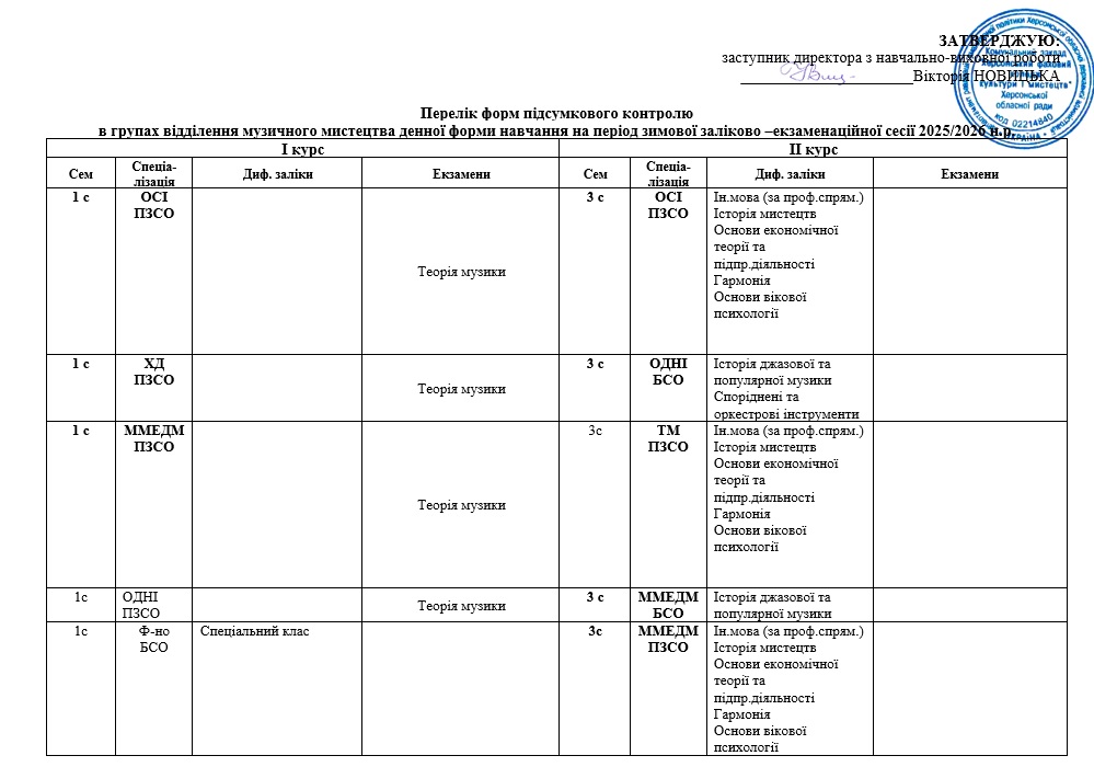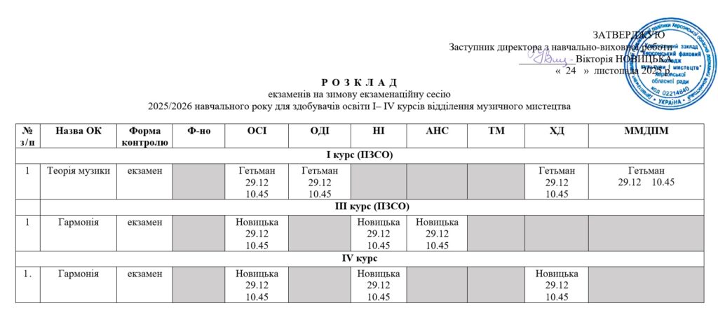 РОЗКЛАД ЕКЗАМЕНІВ АТЕСТАЦІЇ ЗДОБУВАЧІВ ФПО ДЕННОЇ ФОРМИ НАВЧАННЯ СПЕЦІАЛЬНОСТІ 023 «ОБРАЗОТВОРЧЕ МИСТЕЦТВО, ДЕКОРАТИВНЕ МИСТЕЦТВО, РЕСТАВРАЦІЯ», СПЕЦІАЛЬНОСТІ 024 «ХОРЕОГРАФІЯ», СПЕЦІАЛЬНОСТІ 025 «МУЗИЧНЕ МИСТЕЦТВО», СПЕЦІАЛЬНОСТІ 026 «СЦЕНІЧНЕ МИСТЕЦТВО» З 16.06. ПО 28.06.2025 РОКУ